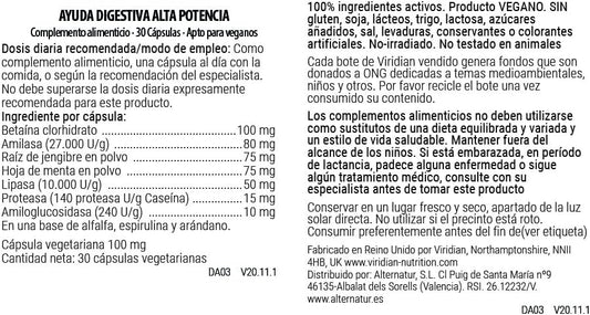 Fournisseur :Viridian Aide digestive haute puissance 30 Vcaps
