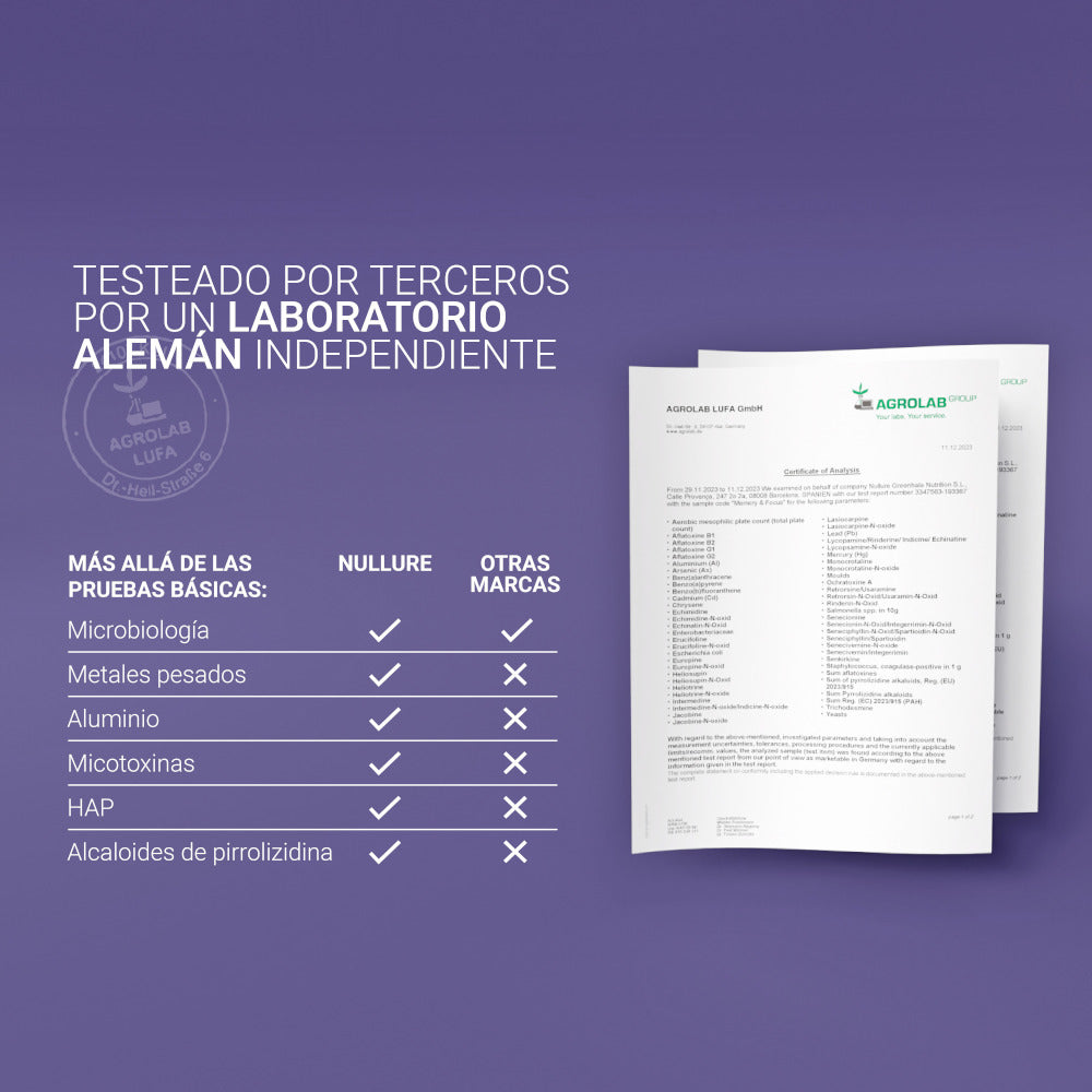 Es un suplemento pensado para quienes buscan un apoyo cerebral limpio y transparente, analizado por laboratorios independientes en búsqueda de metales pesados, bacterias, micotoxinas y otros contaminantes.