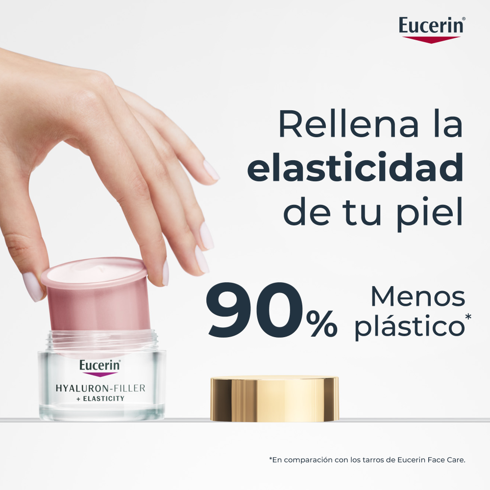 Esta Recarga de HYALURON-FILLER + ELASTICITY Día Rosé FPS 30 contiene un 90 % menos de plástico en comparación con el envase habitual de cuidado facial de Eucerin.